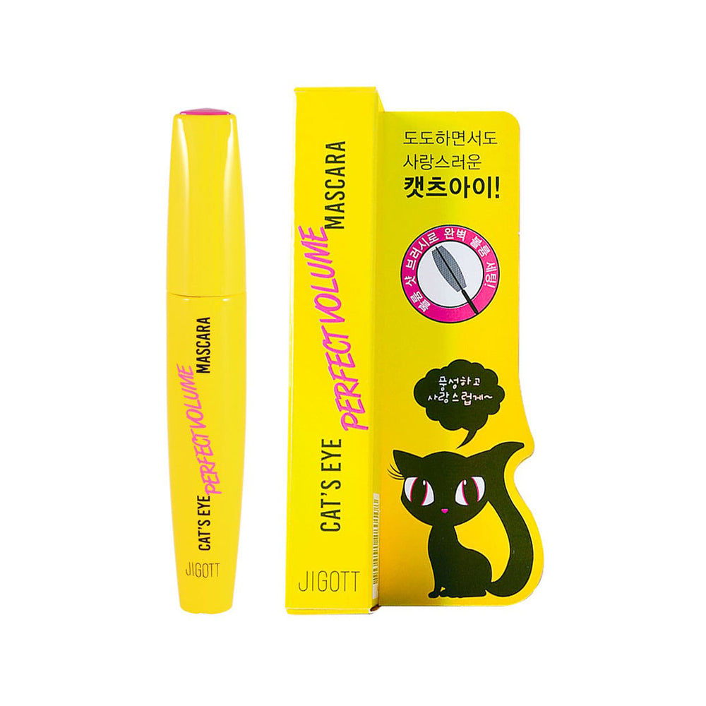 The Jigott Cat's Eye Perfect Volume Mascara is formulated to thicken and plump lashes, aiming to provide volume and definition through its specialized formula and brush design. It's intended to enhance the lashes, giving them a fuller and larger appearance for a bold eye look.