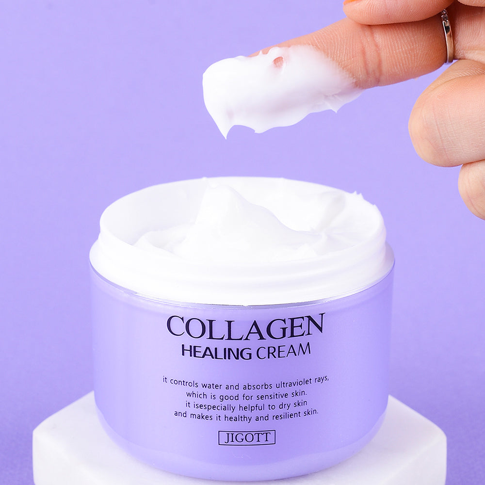 The Jigott Collagen Healing Cream is designed to boost skin elasticity and firmness through its collagen-infused formula, aiming to reduce the visible signs of aging such as wrinkles and fine lines. This cream seeks to rejuvenate and hydrate the skin, promoting a more youthful and revitalized appearance.